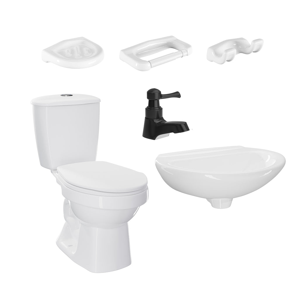 Sello ambiental: Disfruta del encanto del estilo tradicional en tu baño con el combo Laguna Balta, que incluye un sanitario Laguna de dos piezas, un lavamanos Milano sin pedestal, una grifería Balta de palanca y un kit de accesorios Astro de 3 piezas. Con el perfil de taza redondo y altura tradicional del sanitario, su sistema de accionamiento de botón sencillo tipo push garantiza una descarga eficiente. El lavamanos Milano agrega elegancia, mientras que la grifería Balta proporciona un chorro de agua espumoso y ahorro de agua. Completa el combo con los accesorios porcelana del kit Astro, que incluyen una jabonera, percha y portarrollo. Nueva Grifería Mate Black diseño innovador