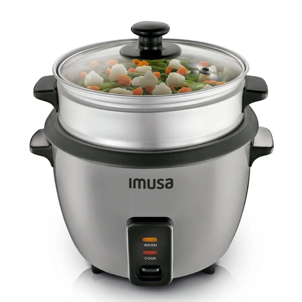 Arrocera 8 Tazas IMUSA Gris Esta arrocera permite cocinar perfectamente cualquier tipo de arroz garantizando una cocción óptima. Su material es acero inoxidable el cual es resistente a altas temperaturas, fácil de limpiar y no permite que tus alimentos cambien de sabor. • Las luces indicadoras permiten saber cuándo el arroz ya está listo haciendo tu manera de cocinar mucho más fácil y optimizando el tiempo. • Cuenta con una capacidad de 8 tazas ideal para grandes preparaciones. • Incluye cesta de vapor para cocinar saludablemente. • Su recipiente es antiadherente y removible lo que facilita la limpieza. • Incluye cuchara y taza medidora para obtener la medida perfecta en tus preparaciones. Solo para uso doméstico. No calientes o utilice el producto sin alimento en el interior. No uses utensilios metálicos ya que pueden deteriorar el antiadherente. No almacenes alimentos en el producto ya que puede generar manchas y s de color. No cortes alimentos dentro del producto. Usar utensilios de silicona, madera o nylon.