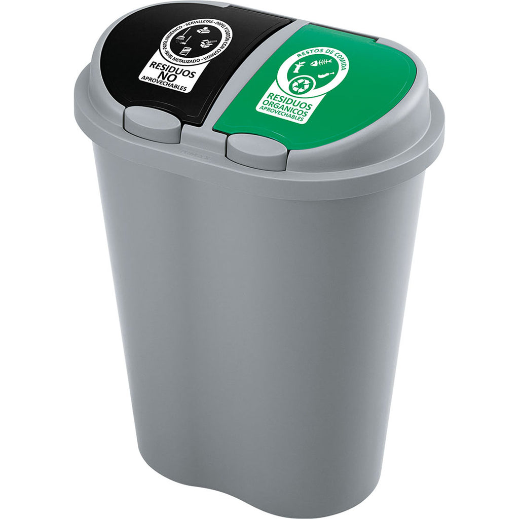 Color reglamentario, tamaño ideal Basurero Pedal Doble. Capacidad total de 5, Litros. El contenedor cuenta con separadores de bolsas para separación de residuos. Cuenta con una base que fijan la bola al cuerpo . Sistema push (empuje) que evita contacto con residuos. Marcación sobre tapa para Negro No Aprovechable y Verde Orgánico Aprovechable. El contenedor de color negro es para depositar los residuos no aprovechables como, servilletas, papel y cartón con comida, papel metalizado, papel higiénico. El contenedor de color verde es para depositar residuos orgánicos aprovechables como restos de comida.