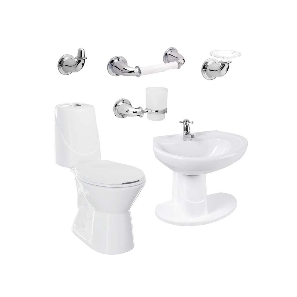 Combo Happy II Blanco sanitario, lavamanos con semipedestal, grifería y accesorios