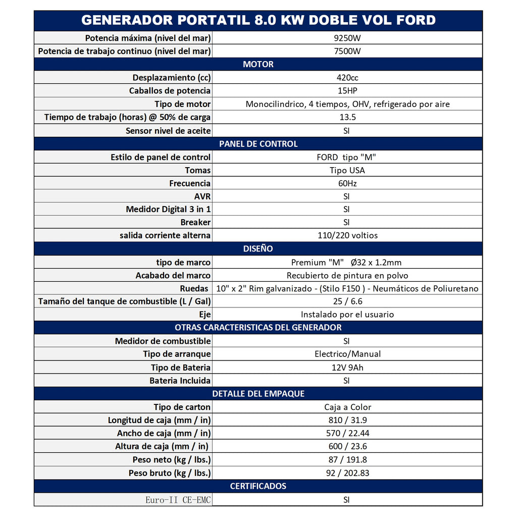 Generador Portátil Abierto Potencia de 8.0KW con Ruedas Ford