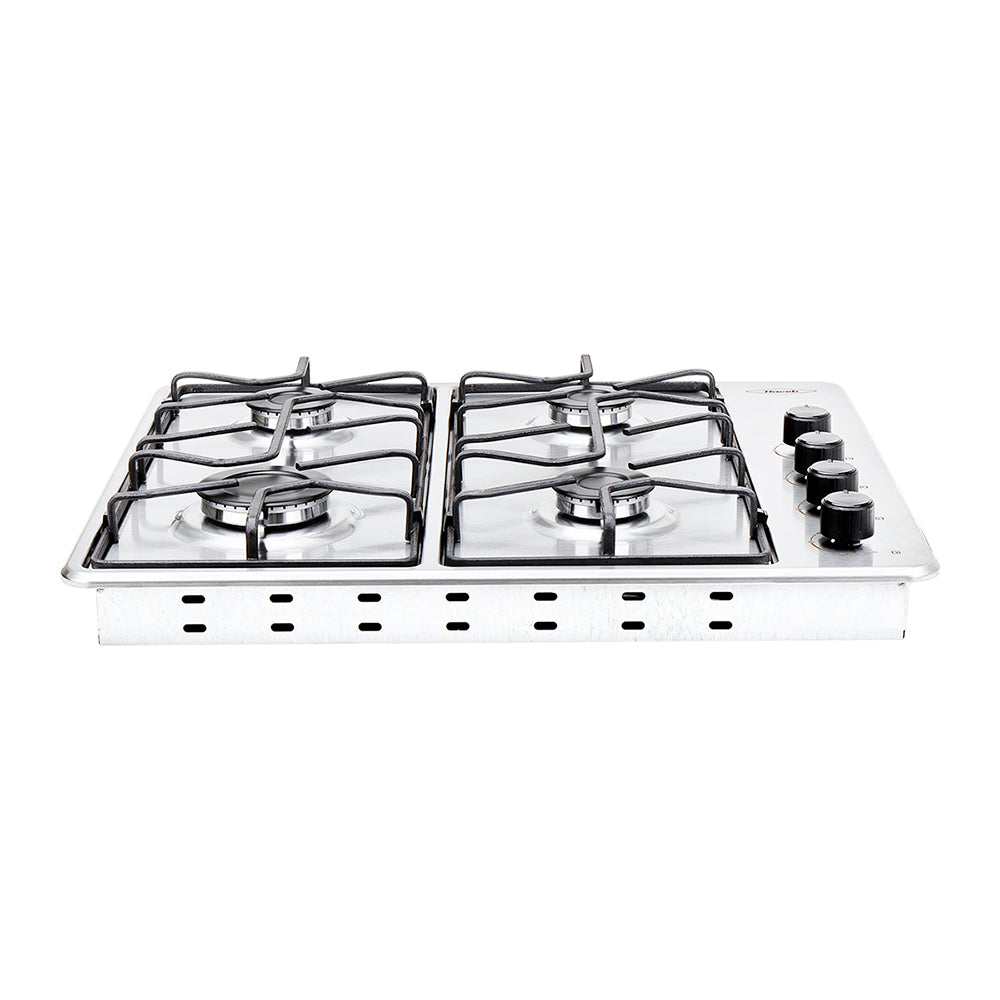 Estufa de empotrar a gas en acero inoxidable de 60x51 cm con quemadores de diferentes tamaños para adaptarse a los diámetros de tus ollas y el peso de tus preparaciones. Cuenta con parrillas continuas de platina para mayor estabilidad y seguridad al cocinar. encendido automático con solo girar la perilla; zona antiderrames y perillas removibles