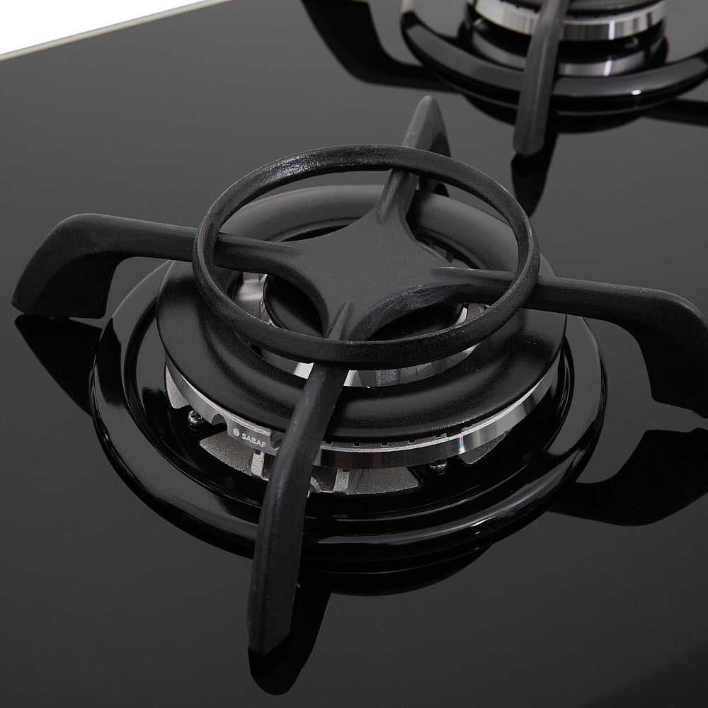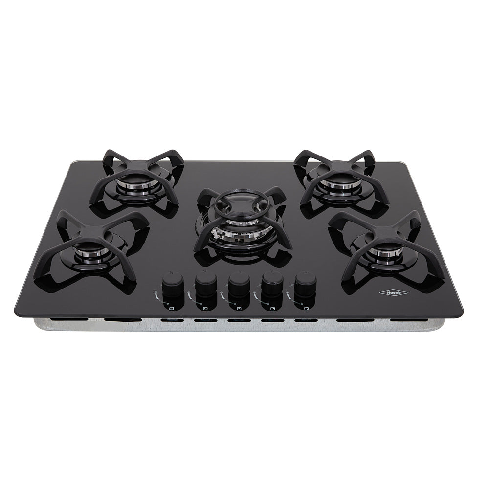"Cubierta en cristal negro de 76 cm de ancho con 5 puestos a gas y parrilas en hierrofundido que brindan estabilidad." Quemador triple corona para mayor potencia al cocinar