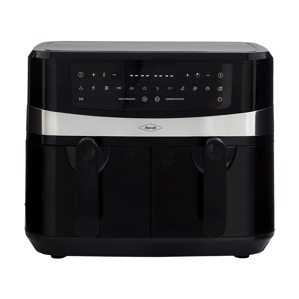 Doble capacidad para recetas más grandes, en simultáneo y sin necesidad de usar aceite con la freidora Haceb doble canasta. Tiene capacidad de 8 litros, control de tiempo y temperatura en el panel digital y 12 programas predeterminados. Material antiadherente para su fácil limpieza y diseño con acabados inox. 12 funciones, fácil limpieza, piezas extraibles, Indicador led y alerta de sonido