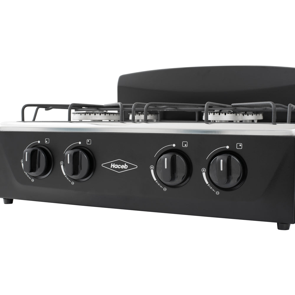 Estufa de mesa en acero inoxidable, espaldar que protege la pared de salpicaduras, fuentes de calor de diferentes tamaños que se adaptan a las necesidades de los usuarios, zon antiderrame, ergonomía y seguridad en perillas y parrillas Parrillas robustas, fogon 35% mas potente, amplia mesa en acero inoxidable