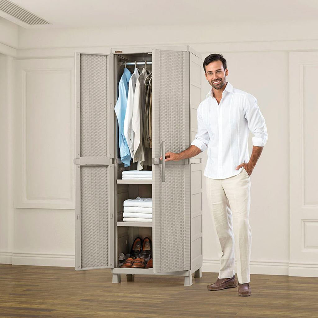 Textura imitación rattan, colores, múltiples usos Armario para Ropa con 2 entrepaños ajustables que resisten hasta 25 Kg cada uno, tubo en aluminio para colgar la ropa, con la profundidad ideal para colgar cómodamente cada prenda e incluye 6 ganchos RIMAX. Fácil de armar, mover y limpiar. Con la resistencia y beneficios del plástico. Excelente capacidad interior, con orificio para uso candado para mayor seguridad. Apariencia artesanal y elegante que acompaña tus espacios de la mejor manera.