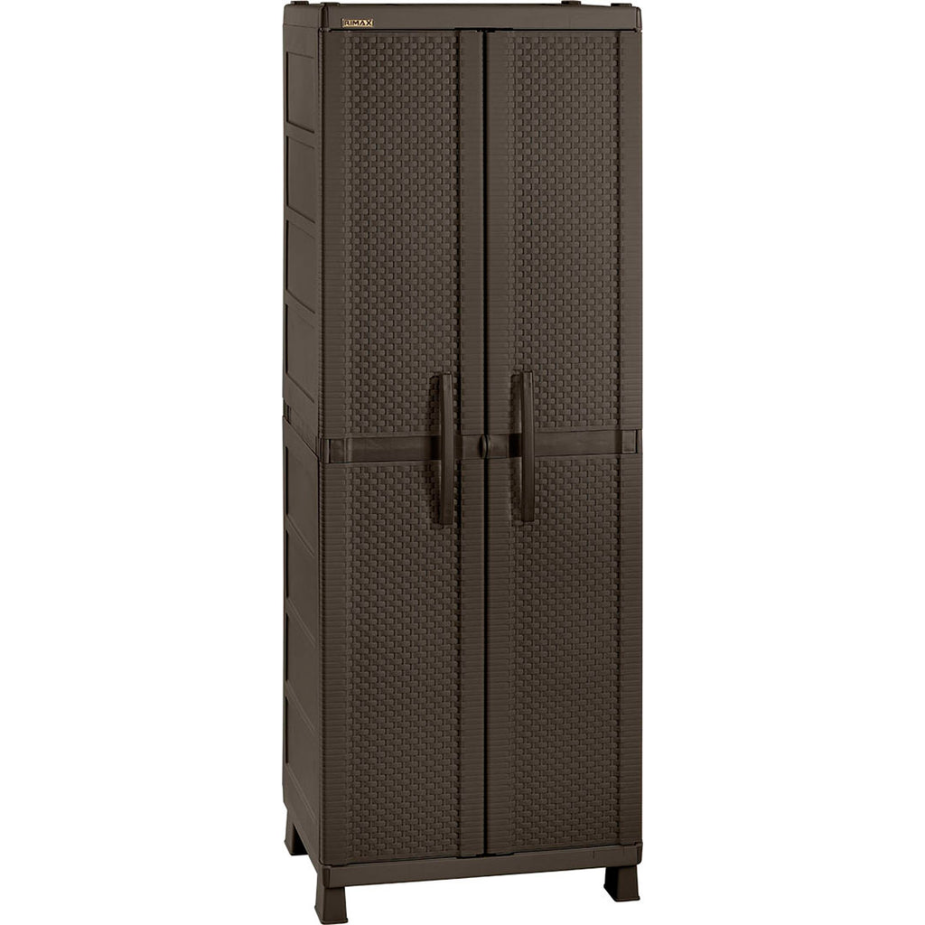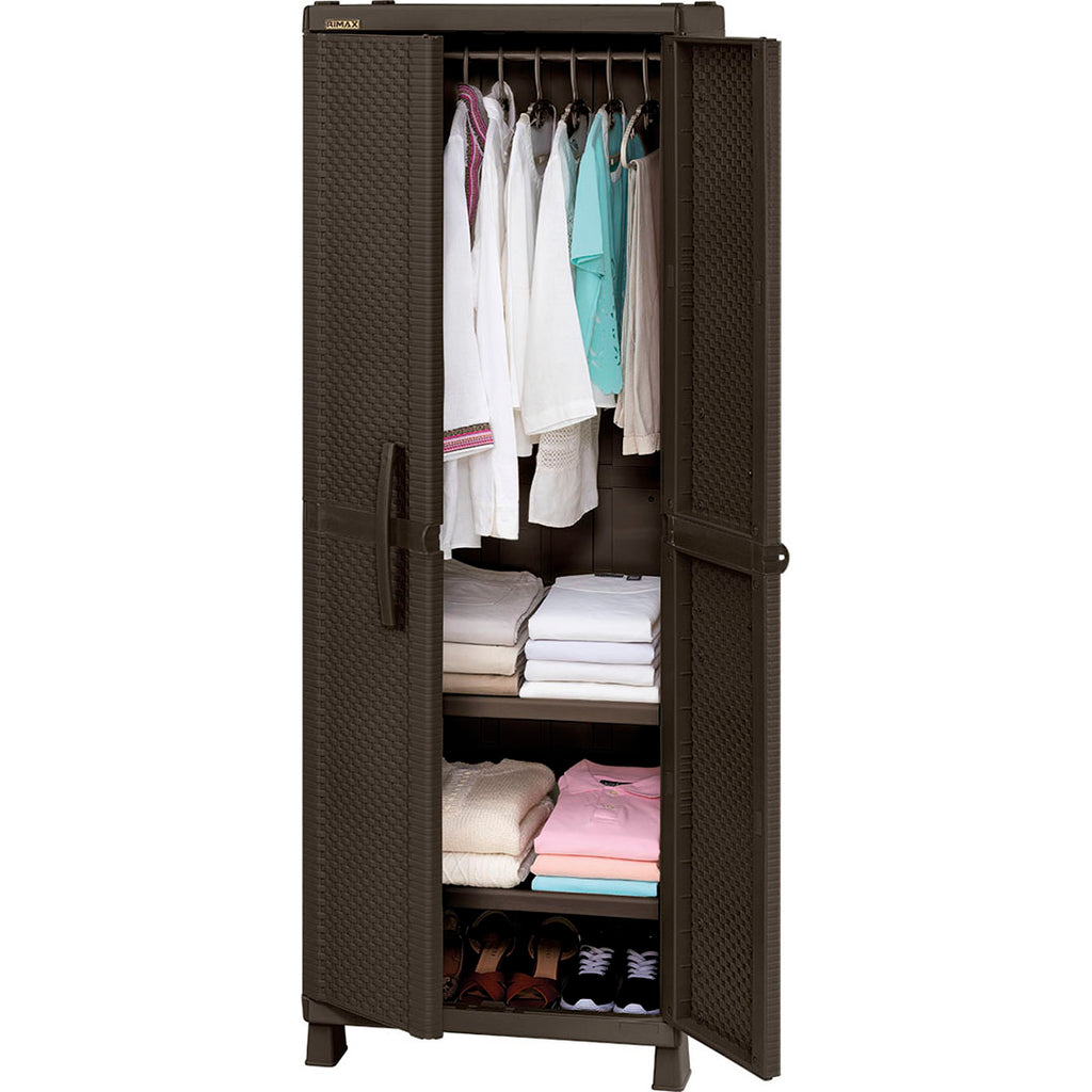 Textura imitación rattan, colores, múltiples usos Armario para Ropa con 2 entrepaños ajustables que resisten hasta 25 Kg cada uno, tubo en aluminio para colgar la ropa, con la profundidad ideal para colgar cómodamente cada prenda. Fácil de armar, mover y limpiar. Con la resistencia y beneficios del plástico. Excelente capacidad interior, con orificio para uso candado para mayor seguridad. Apariencia artesanal y elegante que acompaña tus espacios de la mejor manera.