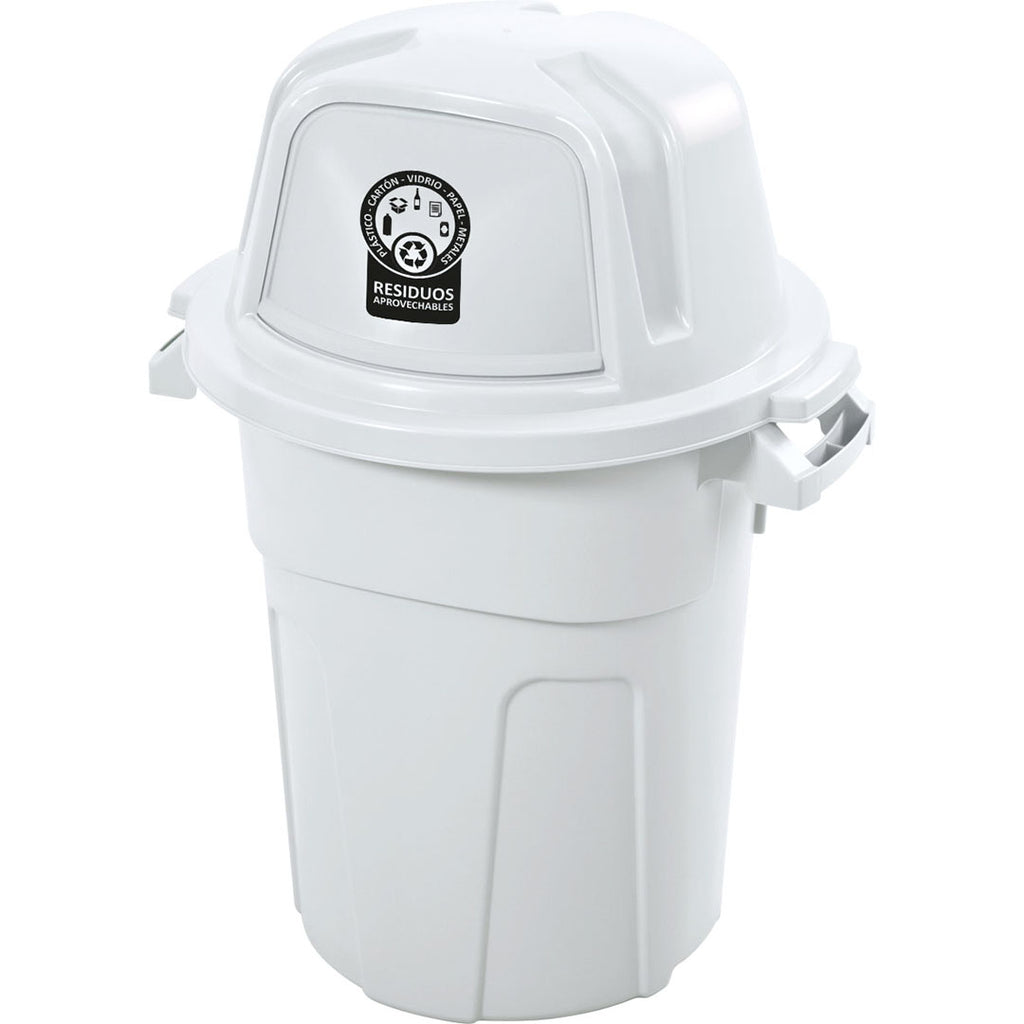 Color reglamentario, tamaño ideal corporativo e institucional Basurero 1,Litros y una tapa con sistema vaivén. Separa en un solo contenedor con tres bolsas con sistema de anillo plástico que permite optimizar el uso de las bolsas al interior del contenedor. Ranuras que fijan la bolsa al cuerpo. Marcación sobre la tapa. Sistema push (empuje) que evita contacto con residuos. Los contenedores de color blanco son para depositar los residuos aprovechables como plástico, vidrio, metales, multicapa, papel y cartón.