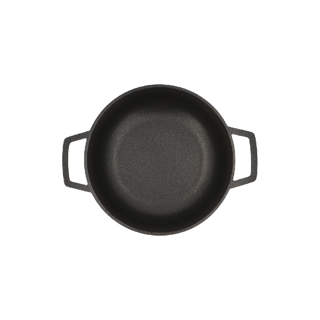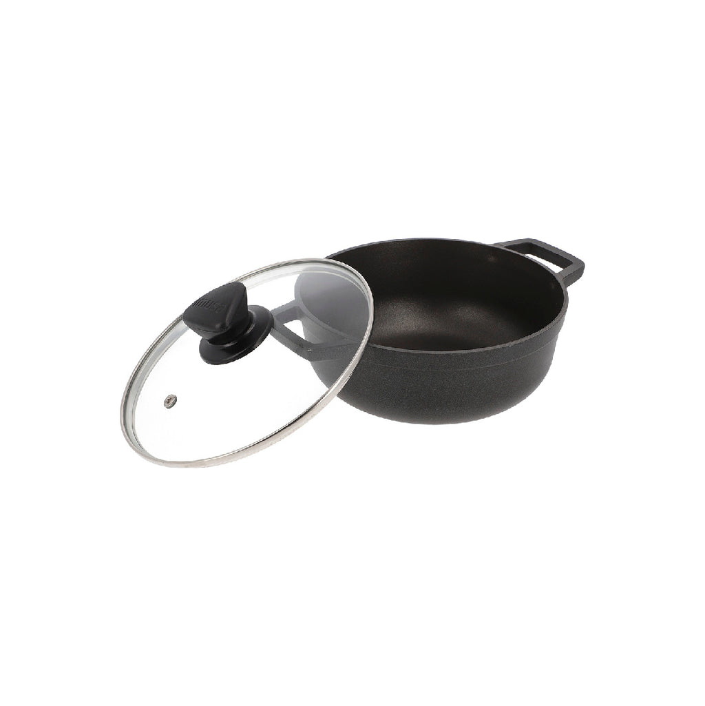 En aluminio fundido que permite excelente difusión y conservación de calor dándole mayor crocancia a tus alimentos. Antiadherente Negro. Con fondo antideslizante y asas más grandes. Cuenta con tapa de vidrio con válvula de salida de vapor. Solo para uso doméstico. No calientes sin alimento en el interior. La llama no se debe extender hasta las paredes del producto. No introduzcas en hornos convencionales ni microondas. Siempre usa protección para retirar el producto después de usarlo. No uses utensilios metálicos ya que pueden deteriorar el antiadherente. No almacenes alimentos en el producto ya que puede generar manchas y s de color. No cortes alimentos dentro del producto. Usar utensilios de silicona, madera o nylon.