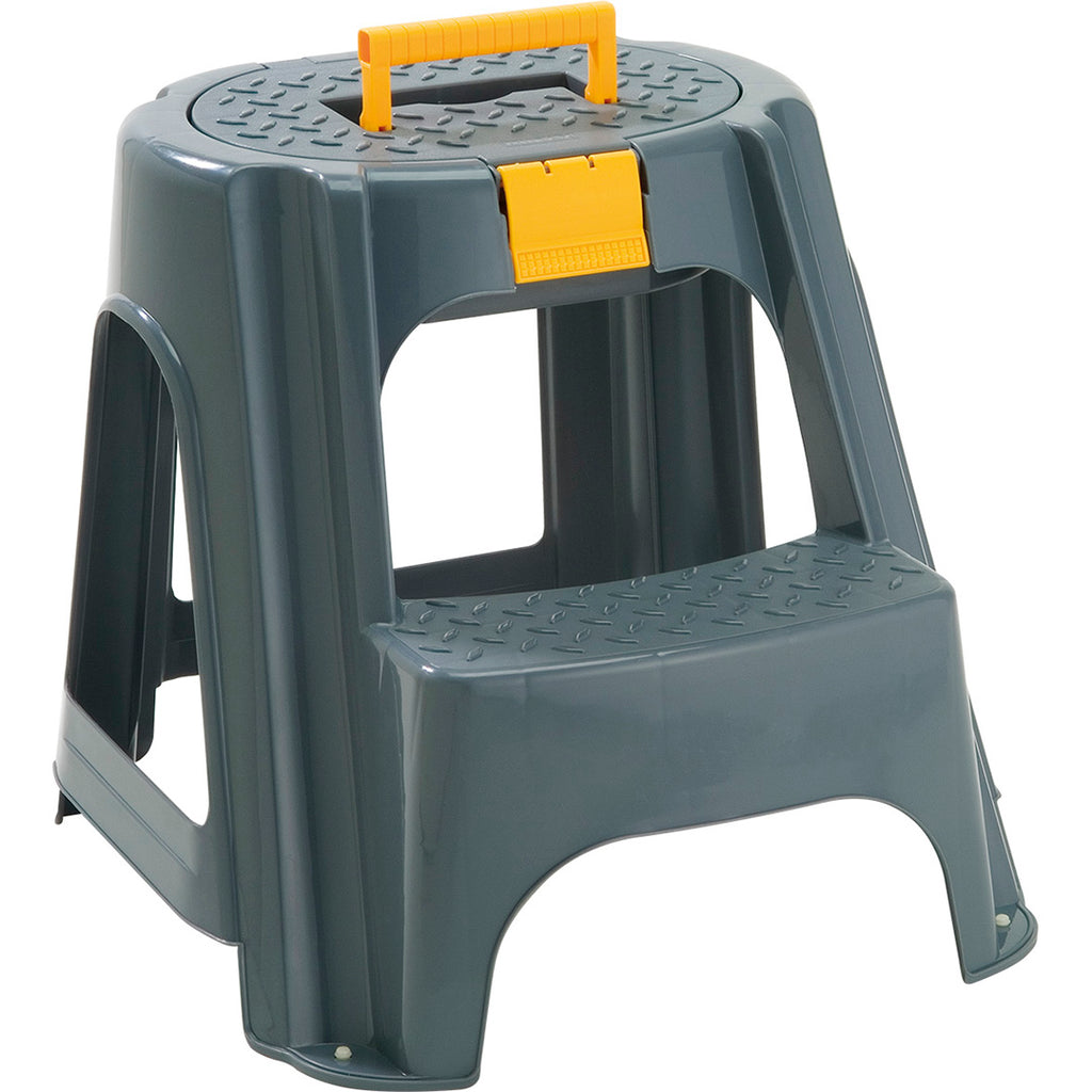 Dos pasos, con tapones antideslizantes, con tapa organizadora para guardar, cogedera para cargar Escalecilla de dos pasos plástica, con tacones antideslizantes y base amplia para brindar mayor seguridad en su uso. Eleva 48 cm de alto y tiene huellas antideslizantes en cada escalón. En el escalón superior tiene un compartimento para transportar y guardar herramientas que facilita su uso.