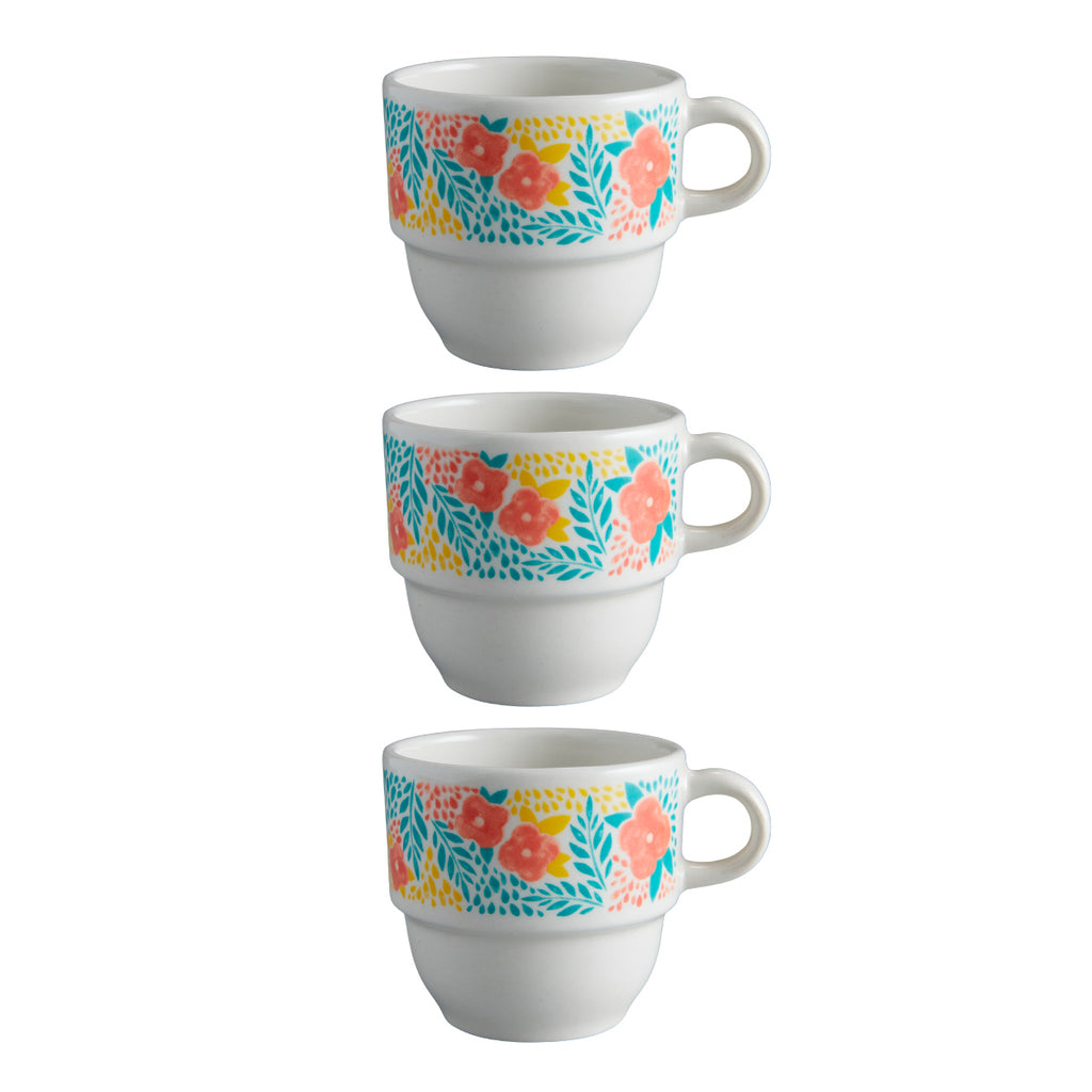 SET 3 POCILLOS TE 201.4CC Pocillos inspirados en la sutileza de las flores de primavera que adornan los jardines. Pocillos apilables con un diseño colorido y alegre para acompañar un delicioso tinto de madrugada.