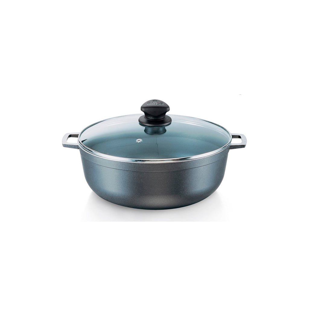 En aluminio fundido que permite excelente difusión y conservación de calor dándole mayor crocancia a tus alimentos. Acabado poroso para generar mayor distribución del calor y la conservación de nutrientes y un sabor excepcional. Con fondo antideslizante y asas más grandes. Cuenta con tapa de vidrio con válvula de salida de vapor. Solo para uso doméstico. No calientes sin alimento en el interior. La llama no se debe extender hasta las paredes del producto. No introduzcas en hornos convencionales ni microondas. Siempre usa protección para retirar el producto después de usarlo. No uses utensilios metálicos ya que pueden deteriorar el antiadherente. No almacenes alimentos en el producto ya que puede generar manchas y s de color. No cortes alimentos dentro del producto. Usar utensilios de silicona, madera o nylon.