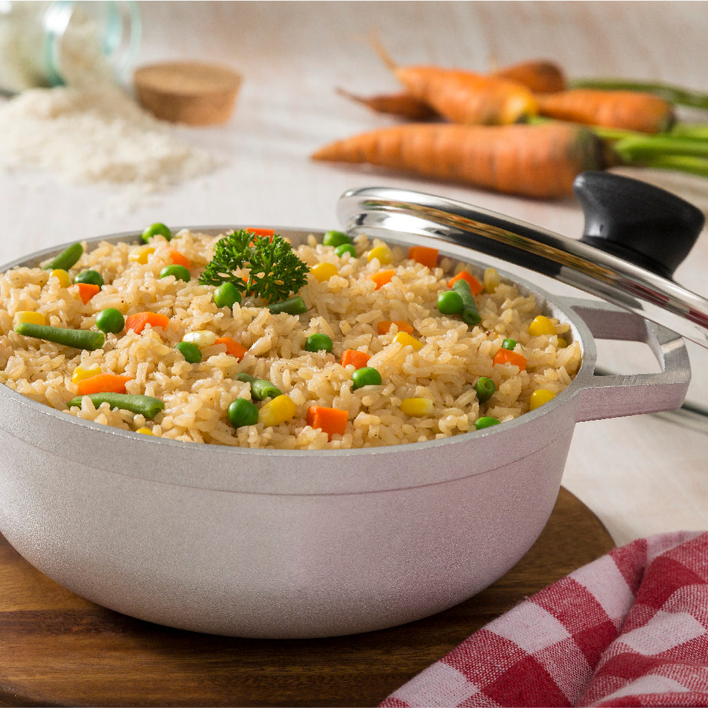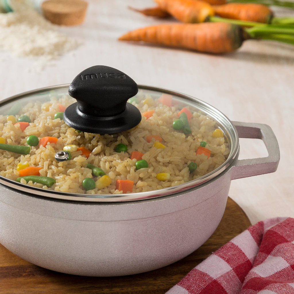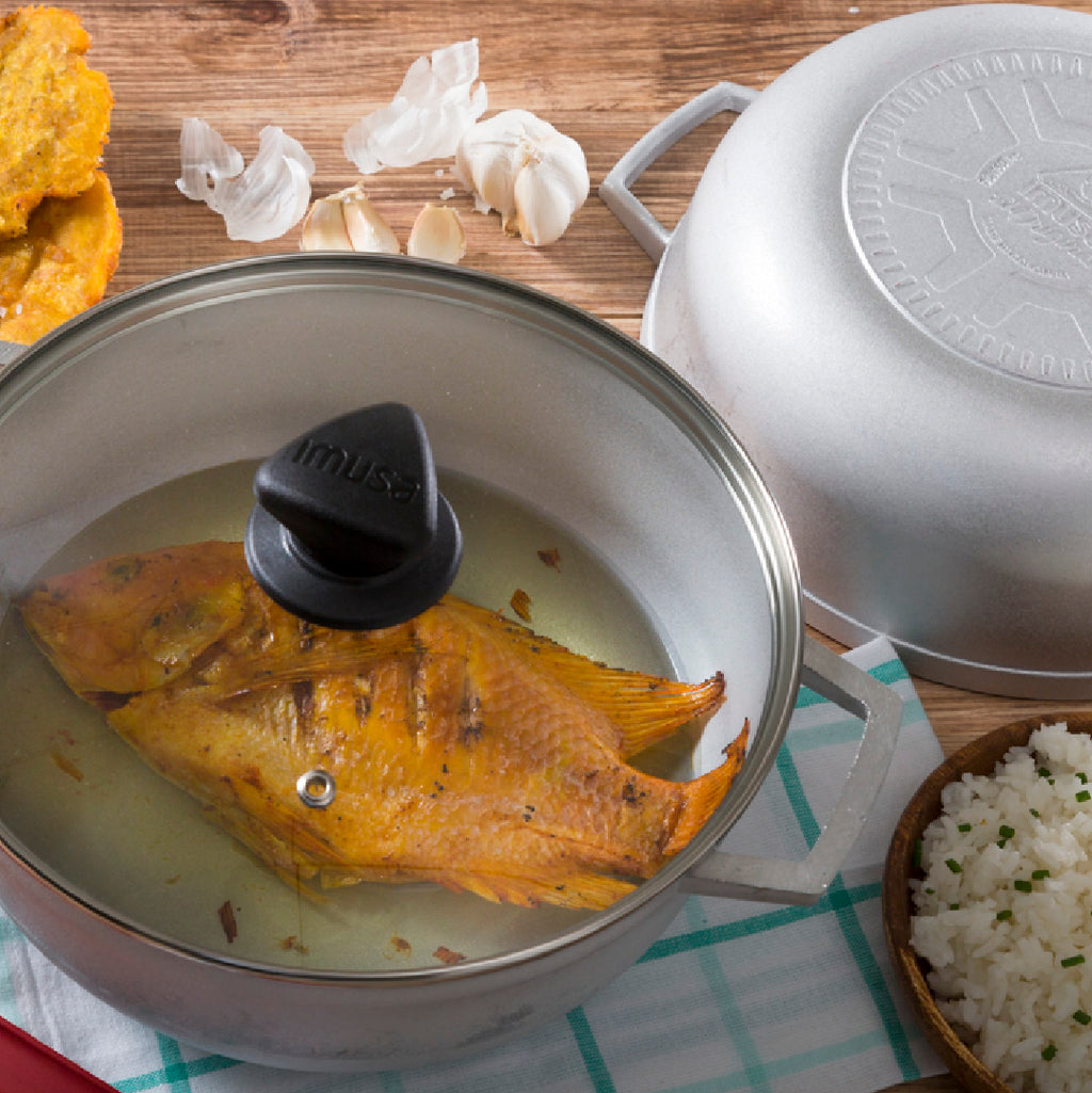 Calderos IMUSA Originales. Aluminio fundido que permite excelente difusión. Fondo antideslizante. Asas más grandes. Tapa de vidrio. En aluminio fundido que permite excelente difusión y conservación de calor dándole mayor crocancia a tus alimentos. • Acabado poroso para generar mayor distribución del calor y la conservación de nutrientes y un sabor excepcional. • Con fondo antideslizante y asas más grandes. • Cuenta con tapa de vidrio con válvula de salida de vapor. Cuenta con Garantía de 1 año y respaldo de la marca IMUSA Solo para uso doméstico. No calientes sin alimento en el interior. La llama no se debe extender hasta las paredes del producto. No introduzcas en hornos convencionales ni microondas. Siempre usa protección para retirar el producto después de usarlo. No uses utensilios metálicos ya que pueden deteriorar el antiadherente. No almacenes alimentos en el producto ya que puede generar manchas y s de color. No cortes alimentos dentro del producto. Usar utensilios de silicona, madera o nylon.