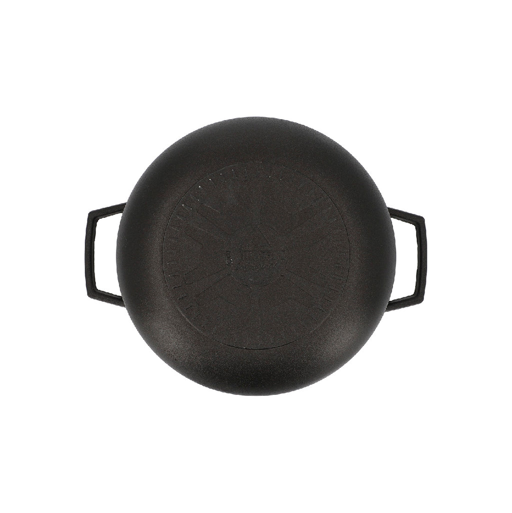 En aluminio fundido que permite excelente difusión y conservación de calor dándole mayor crocancia a tus alimentos. Antiadherente Negro. Con fondo antideslizante y asas más grandes. Cuenta con tapa de vidrio con válvula de salida de vapor. Solo para uso doméstico. No calientes sin alimento en el interior. La llama no se debe extender hasta las paredes del producto. No introduzcas en hornos convencionales ni microondas. Siempre usa protección para retirar el producto después de usarlo. No uses utensilios metálicos ya que pueden deteriorar el antiadherente. No almacenes alimentos en el producto ya que puede generar manchas y s de color. No cortes alimentos dentro del producto. Usar utensilios de silicona, madera o nylon.