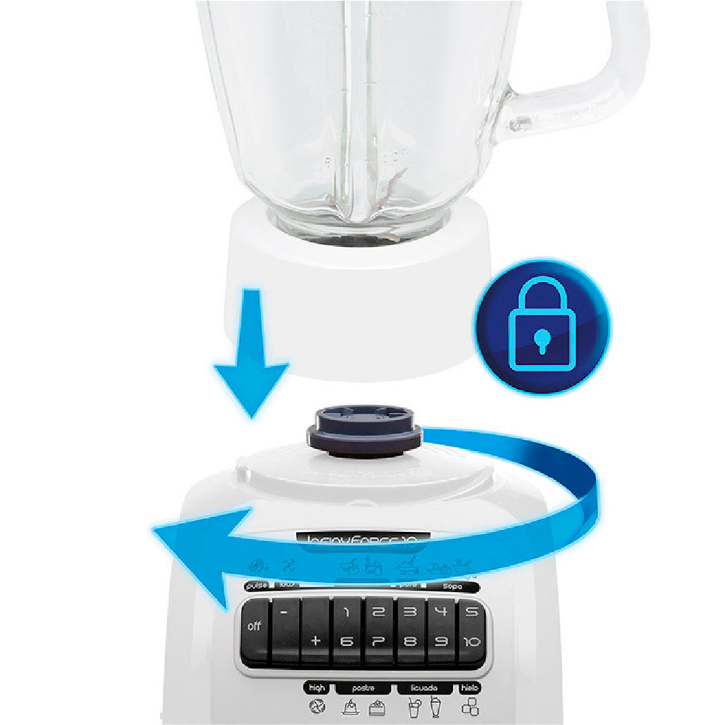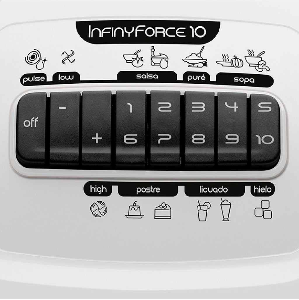 La Licuadora Infiny Force de IMUSA de color Blanco, cuenta con un motor de alta velocidad y 10 funciones diferentes más la función pulso, que garantizan un control total de las preparaciones y consistencias diferentes en las recetas. Por su vaso de vidrio de gran capacidad permite la preparación de licuados de hasta 1.75 litros. Su diseño en vidrio asegura la no absorción de olores de alimentos, ni decoloración del vaso. • Sus 6 cuchillas tienen la exclusiva tecnología Powelix que la hace 3 veces más eficiente que otras licuadoras del mercado. • Además, asegura un alto poder de corte y un fino triturado. • Cuenta con un sistema de bloqueo que asegura el vaso a la base del motor para mayor estabilidad y evitar derrames. Garantía de 2 años respaldo y calidad IMUSA. Solo para uso doméstico. No calientes o utilice el producto sin alimento en el interior. No uses utensilios metálicos ya que pueden deteriorar el antiadherente. No almacenes alimentos en el producto ya que puede generar manchas y s de color. No cortes alimentos dentro del producto. Usar utensilios de silicona, madera o nylon.