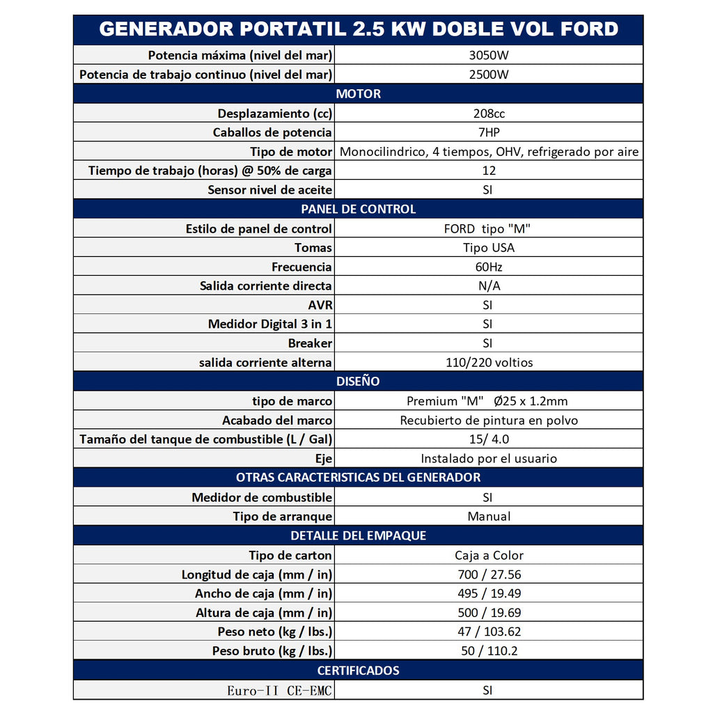 El generador Portátil FORD FG3050P, es el ideal para generar la energía necesaria ya sea para recreación o trabajo en el sitio, cuenta con un motor de 4 tiempos de 180cc refrigerado por aire y encendido manual; chasis compacto con un peso de tan solo 46 kg. Tiene salidas de ca de 120 voltios 20 Amp y una 220 Voltios 30 Amp, Contador digital de horas/voltaje y frecuencia y medidor de gasolina, es silencioso al trabajar con tan sólo 76 db. La capacidad del tanque de gasolina de 15 litros es ideal para prolongar su ciclo de trabajo. Su regulador de voltaje protege los equipos conectados impidiendo daños por picos de voltajes. El sensor de nivel bajo de aceite apaga al motor cuándo no cuenta con el nivel apropiado para su operación, previniendo que el motor sufra daños. En su empaque incluye bolsa de herramientas básicas. Generador eléctrico portátil marca FORD a gasolina de 3050 watts con motor de 180cc. Ideal para recreación o trabajo en sitio, su sensor de nivel bajo de aceite apaga al motor cuando no cuenta con el nivel apropiado para su operación previniendo que el motor sufra daños. Este generador portátil accionado por motor de campo giratorio de corriente alterna (CA), ideal para iluminación o para servir de fuente de resguardo durante apagones eléctricos y trabajos profesionales.Para ver la ficha técnica haz clic aquí