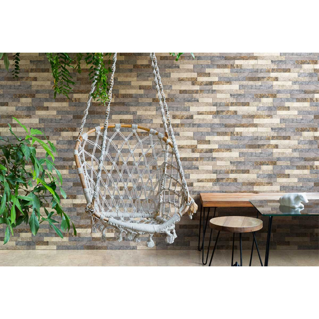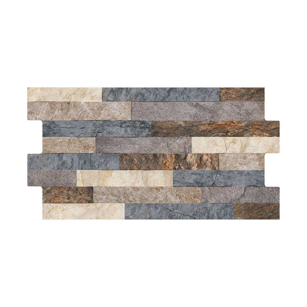Inspirada en las piedras naturales con corte tipo espacato; es decir un formato alargado y fino de gran popularidad por su esbeltez. Su instalación horizontal permite realzar la naturalidad y belleza del espacato. En esta fachaleta observamos una escalera de color con distintas intensidades de gris azulado, óxidos, café, taupé y vainilla; es una pared fachaleta estructurada (superficie con relieve) de acabado mate en formato 34.5x62.