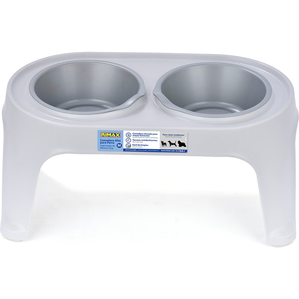 El comedero alto contiene dos recipientes fáciles de extraer, cada recipiene con capacidad de 80 ml , Diseño de borde elevado que evita el derrame de comida y agua al piso, Tacones antideslizantes, Textura lisa mate para fácil limpieza