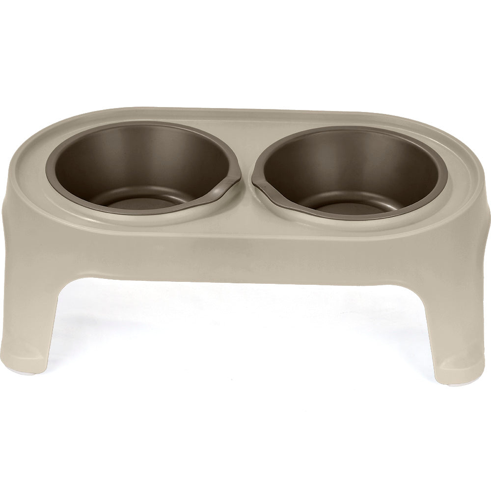el comedero alto contiene dos recipientes fáciles de extraer, cada recipiene con capacidad de 80 ml , Diseño de borde elevado que evita el derrame de comida y agua al piso, Tacones antideslizantes, Textura lisa mate para fácil limpieza