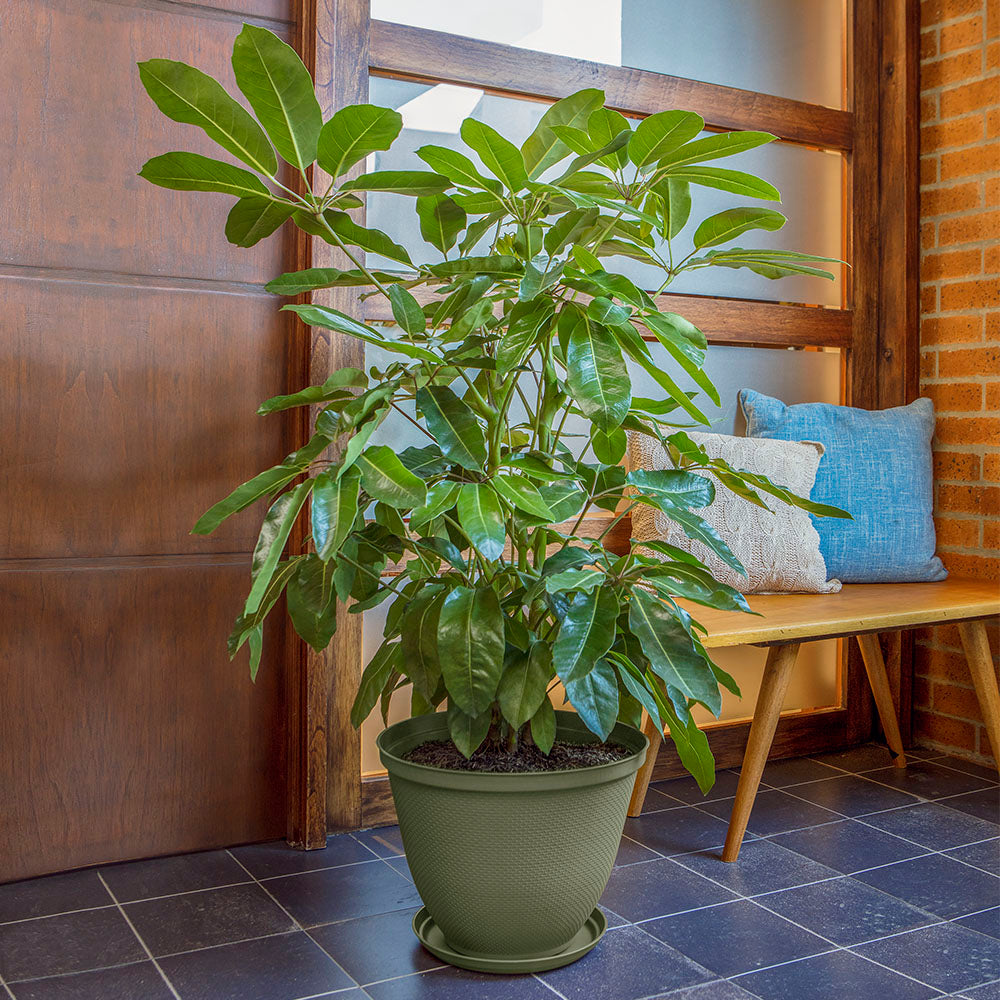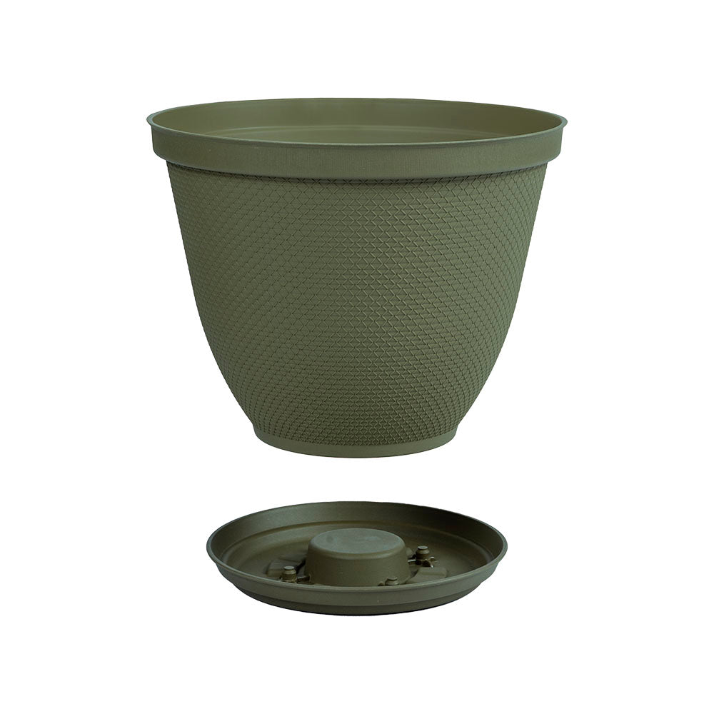 Con su variedad de colores, textura que simula al tejido natural y diseño minimalista, las Materas con TEXTURA RAFIA da a tus espacios es toque de elegancia clásica que resalta tus espacios. Riega tus plantas por absorción a través del plato, con clic para asegurar matera y plato. Ideal para interiores y exteriores. Color: Verde musgo. Dimensiones: alto: 27,3. ancho: 35,6. Largo: 35,6. Peso:,4,