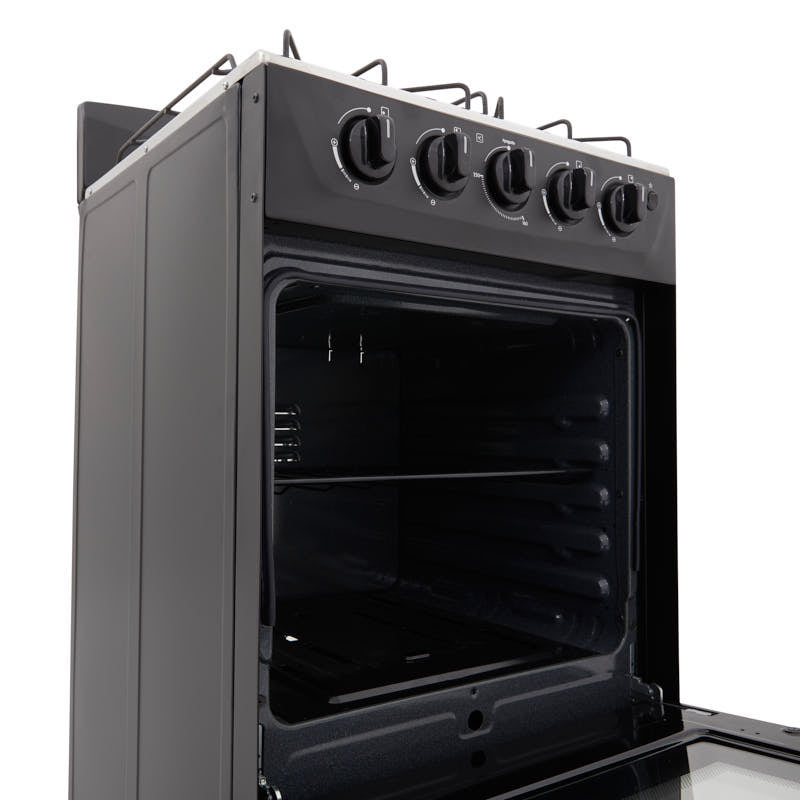 Estufa Haceb de 50 cms de ancho con mesa en acero inoxidable y encendido eléctrico, negra, el color que mejor contrasta en las cocinas colombianas. Con cuatro fogones de diferentes tamaños para versatilidad en la cocción, parrilla contínua antideslizante que da estabilidad a los recipientes y horno de gran capacidad con visor amplio para hacer seguimiento a sus recetas. Además, el respaldo único de servicio Haceb.