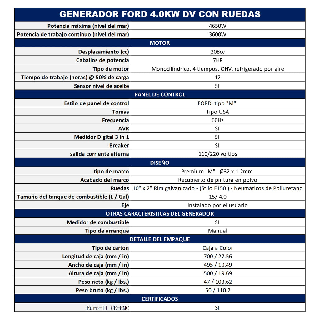 Usos y aplicaciones:- Ideal para su próxima aventura al aire libre, recreación y camping-Perfecto para lugares de obra y mantenimiento sin acceso a energíaCaracterísticas-LLega a 4650 Vatios de pico y 3600 vatios en funcionamiento de potencia-De practico uso para tomacorrientes de 120 Voltios Y 20 Amperios / Hasta tomacorriente de 220 Voltios a 30 Amperios-Su funcionamiento continuo a medía carga con solo 4 galones de combustible permite trabajar hasta por 11 horas, para que pueda estar tranquilo. -De silencioso Funcionamiento , motor OHV mono cilíndrico de 4 tiempos produce solo 76 decibelios de ruido a 7 metros, permitiendo ser silencioso mientras esta funcionando. -Tiene un medidor digital que también muestra las horas de funcionamiento que es ideal para saber cuándo se necesitan los servicios.-Cuenta con Llantas Cromadas y Neumáticos rellenos de espuma que son a prueba de pinchazos, que sirven para un desplazamiento seguro y cómodo. -El motor OHV mono cilíndrico de 4 tiempos refrigerado por aire te brinda una potencia máxima de 3,8 kW y una continua de 2,8 kW. Cuenta con un cable de arranque de retroceso que hace que este generador sea fácil de arrancar.Para ver la ficha técnica haz clic aquí