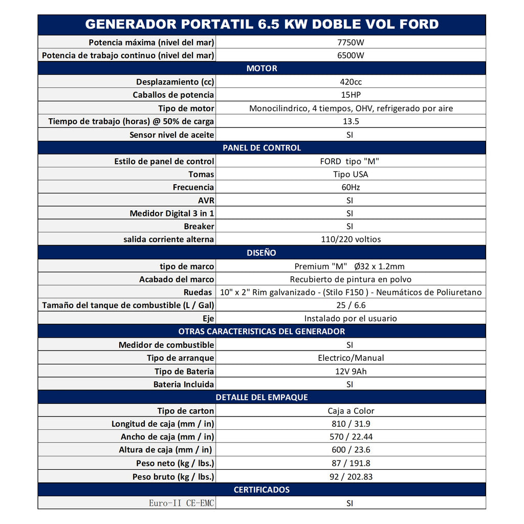 El generador Portátil FORD FG7750PE, es el ideal para generar la energía necesaria ya sea para recreación o trabajo en el sitio. Incorpora un motor de 4 tiempos de 420cc refrigerado por aire, chasis compacto con un peso de tan solo 96 kg. Cuenta con dos salidas de 120 V 20 Amp, una salida de 220 V a 50 Amp en su panel de control, cuenta con un controlador digital de horas/voltaje y frecuencia y medidor de gasolina mecánico, al trabajar con sólo 78 db lo hace silencioso. Su tanque de gasolina de 25L es ideal para prolongar su ciclo de trabajo. Su regulador de voltaje automático protege los equipos conectados impidiendo daños por picos de voltajes. El sensor de nivel bajo de aceite apaga al motor cuándo no cuenta con el nivel apropiado para su operación previniendo que el motor sufra daños. En su empaque incluye una bolsa de herramientas básicas. Generador eléctrico portátil marca Ford a gasolina de 7750 watts con motor de 420cc. Ideal para recreación o trabajo en sitio, permitiendo más de 11 horas de trabajo continuo. Equipado con regulador de voltaje y sensor de nivel bajo de aceite.Para ver la ficha técnica haz clic aquí