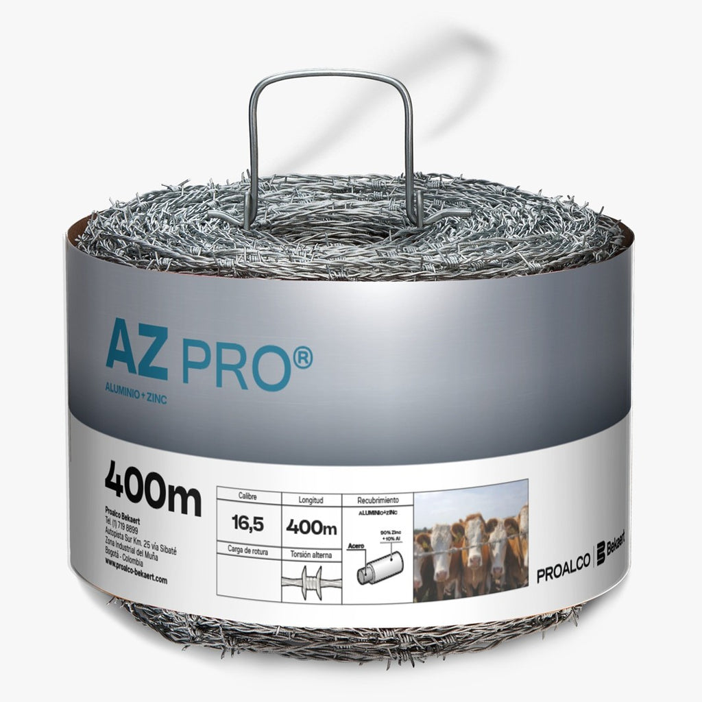 "Es el unico alambre de púas del mercado fabricado con un recubrimiento de Aluminio + Zinc, ofreciendo una duracion contra la corrosión, siete veces mas que un galvanizado convencional. Ideal para las condiciones climaticas de humedad y salinidad mas agresivas. Es de fácil manupulacion por su bajo peso, soporta animales de gran tamaño. Es la solucion ideal para uso en terrenos planos. Longitud: 400 mts. Recubrimiento: Aluminio + Zinc Posicionamiento de la pua: Sobre puestas"