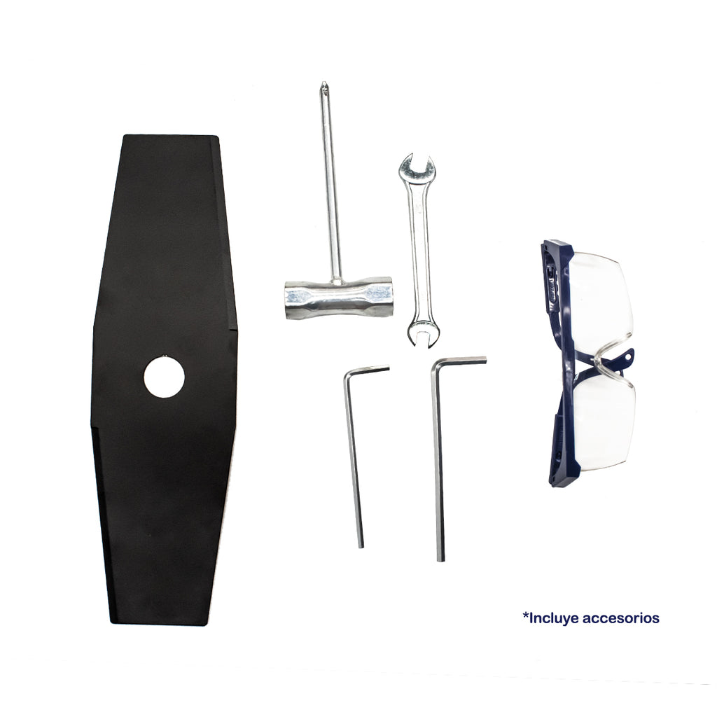 GUADAÑA DE INTENSIDAD DE USO MEDIA/ ALTA, IDEAL PARA ESPACIOS DE DIFICIL ACCESO (ESTRECHOS / INCLINADOS) SU SISTEMA DE AGARRE CERRADO LA HACE APTA PARA CULTIVOS DONDE SE REQUIEREN LABORES DE ZOQUEO Y LIMPIEZA DE TERRENOS EN GENERAL. ACCESORIOS: Cuchilla 305x90x1.6mm, Gafas de seguridad, Kit de herramientas, Accesorios Guadaña