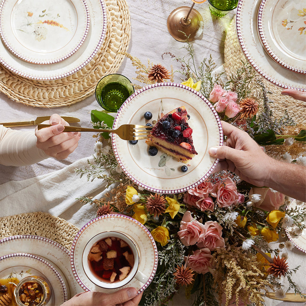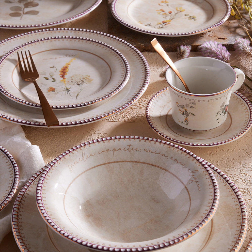 Diseños de follajes, texturas suaves en el fondo y lista color cobrizo hacen de esta vajilla una perfecta armonía entre el diseño romántico y clásico traído a lo actual. Una decoración para lucir en tu mesa.