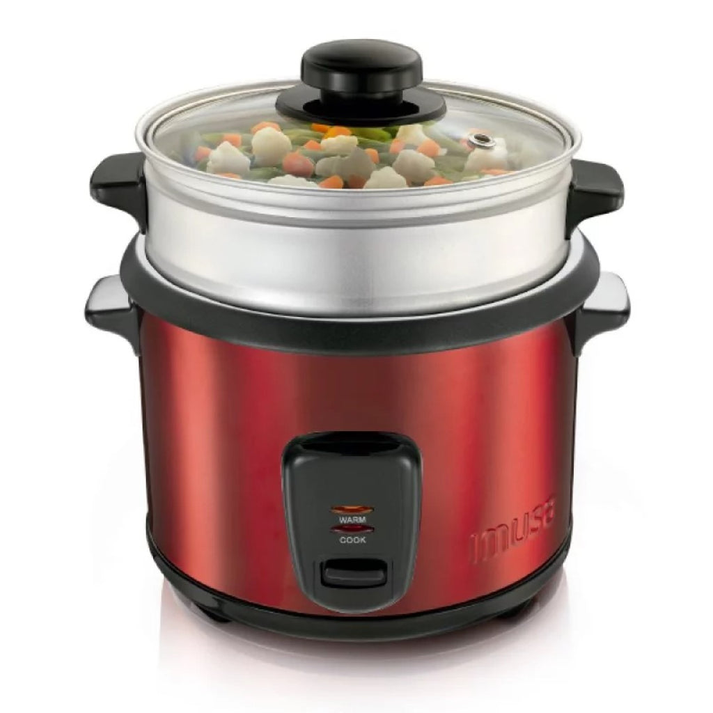 Arrocera 5 Tazas IMUSA Acero Rojo Cocción perfecta que garantiza una excelente textura en el arroz. Capacidad de 5 tazas. En acero inoxidable que resiste a altas temperaturas, es fácil de limpiar y no cambia el sabor de los alimentos. • Luces indicadoras que permiten saber cuándo el arroz ya está listo haciendo que cocines más fácilmente. • Cuenta con una cesta de vapor para cocinar saludablemente. • Su recipiente es antiadherente y removible lo que facilita su limpieza. • Incluye cuchara y taza medidora para obtener la porción perfecta. Solo para uso doméstico. No calientes o utilice el producto sin alimento en el interior. No uses utensilios metálicos ya que pueden deteriorar el antiadherente. No almacenes alimentos en el producto ya que puede generar manchas y,s de color. No cortes alimentos dentro del producto. Usar utensilios de silicona, madera o nylon.