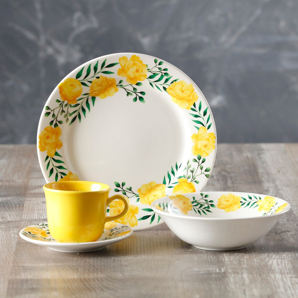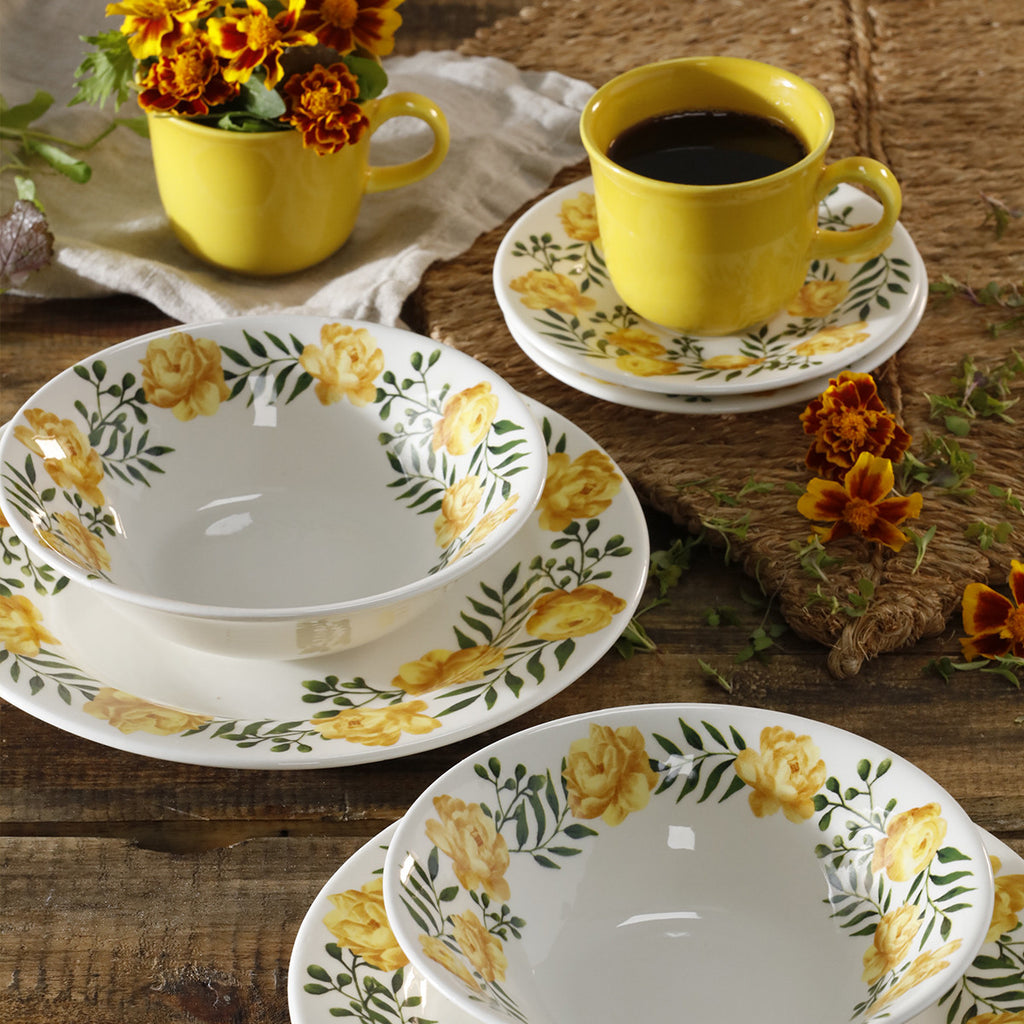 Vajilla con toques florales, en tono amarillo muy cálida. VAJILLAS