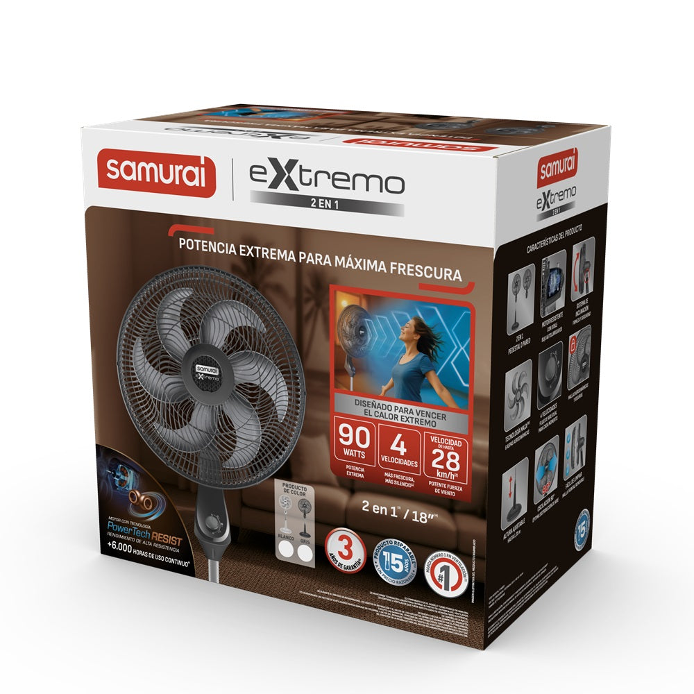 Descubre el equilibrio ideal entre potencia, diseño y seguridad con el ventilador Samurai Extremo. Su motor de alto rendimiento, aspas eficientes y mallas aerodinámicas se unen para ofrecerte una experiencia de frescura superior. Con múltiples velocidades, inclinación ajustable, doble presentación (pared o pedestal) y altura regulable, este ventilador se adapta a tu estilo de vida. ¡La frescura nunca fue tan versátil y segura! El Samurai Extremo cuenta con tecnología de alta resistencia que garantiza comodidad y eficiencia durante todo el día. Ofrece una velocidad de hasta 28 km/h y cuatro niveles de ventilación: Silencio, Eco, Comfort y Máxima Potencia. Tiene una potencia de 90 watts, ideal para climas extremos. Su sistema de inclinación permite seis posiciones para direccionar el aire, y sus mallas aerodinámicas brindan seguridad. Puede instalarse en pared o pedestal, y su altura es ajustable hasta 1.35 metros.